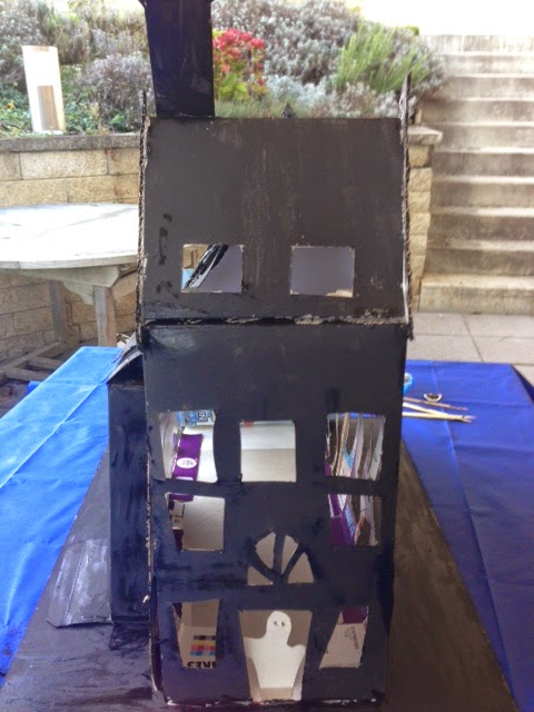 Britt and I made this haunted house for a special primary Halloween party at school. We are going to put it in the middle of a table to inspire children to draw their own Halloween haunted houses using white paint pens on black paper.