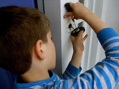 An electrician was working at our house yesterday.  He let me take a picture of some of the beautiful thingamajigs which he uses in his work.  I loved the primary colors of the different do-dads separated into little compartments.  While he was here I showed him the broken doorbell.  He said that the button and plate needed to be replaced, and that my husband could do it himself.  The wires are very low voltage.  The electrician showed me that it is safe to touch them,  and told me that it is a simple job.  I decided that my son could do it with my assistance.